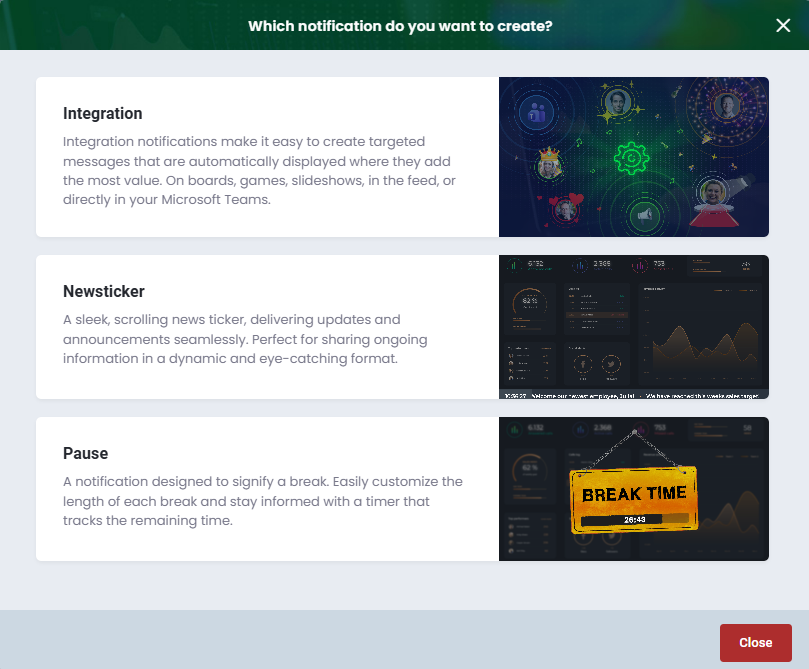 With notifications, you have the option to highlight news and events on boards, games and slideshows. You also have the option to send notifications to Microsoft Teams.