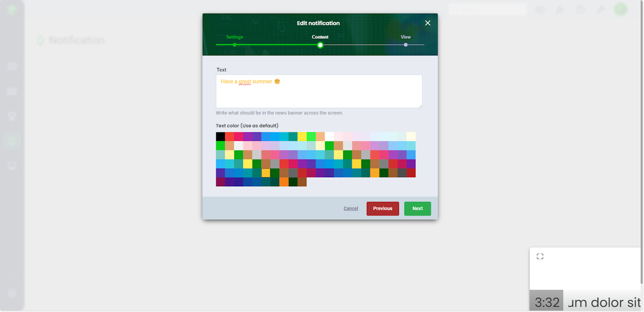 If no color is selected, a default color is selected. The color of the newsticker, is determined by your selected color theme. If you want multiple news items to run across the screen consecutively, simply create additional news notifications and assign them to your board, game or slideshow.