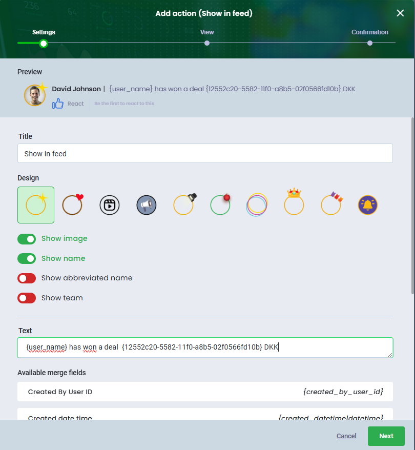 - In the next step, you can customize the visual, you can show image, name, add text, and use merge fields with to customize your content
